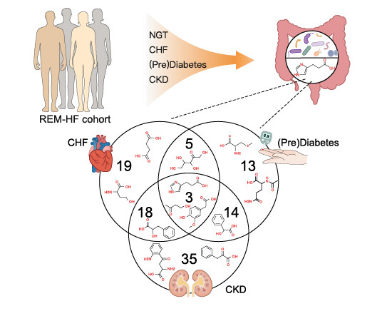 This study aimed to identify microbial signatures that contribute to the shared etiologies between chronic heart failure (CHF), type 2 diabetes, and chronic kidney disease. The serum levels of 151 microbial metabolites were measured in 260 individuals from the Risk Evaluation and Management of heart failure cohort, and it was found that those metabolites varied by an order of 105fold. Out of 96 metabolites associated with the three cardiometabolic diseases, most were validated in two geographically independent cohorts. In all three cohorts, 16 metabolites including imidazole propionate (ImP) consistently showed significant differences. Notably, baseline ImP levels were three times higher in the Chinese compared with the Swedish cohorts and increased by 1.1–1.6 fold with each additional CHF comorbidity in the Chinese population. Cellular experiments further supported a causal link between ImP and distinct CHF relevant phenotypes. Additionally, key microbial metabolite-based risk scores were superior in CHF prognosis than the traditional Framingham or Get with the Guidelines-Heart Failure risk scores. Interactive visualization of these specific metabolite-disease links is available on our omics data server (https://omicsdata.org/Apps/REM-HF/).